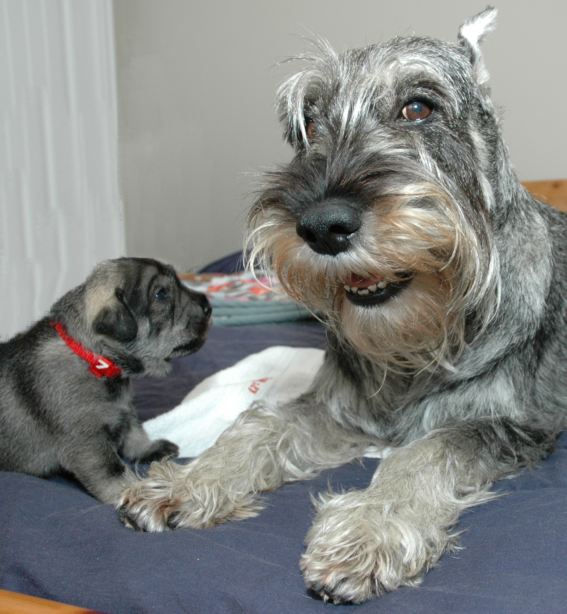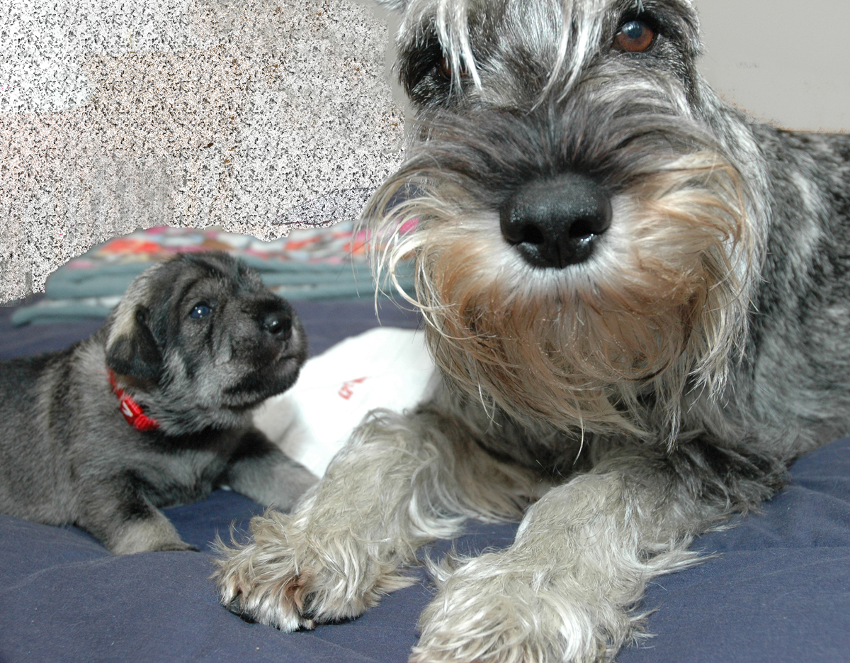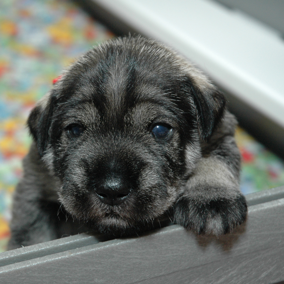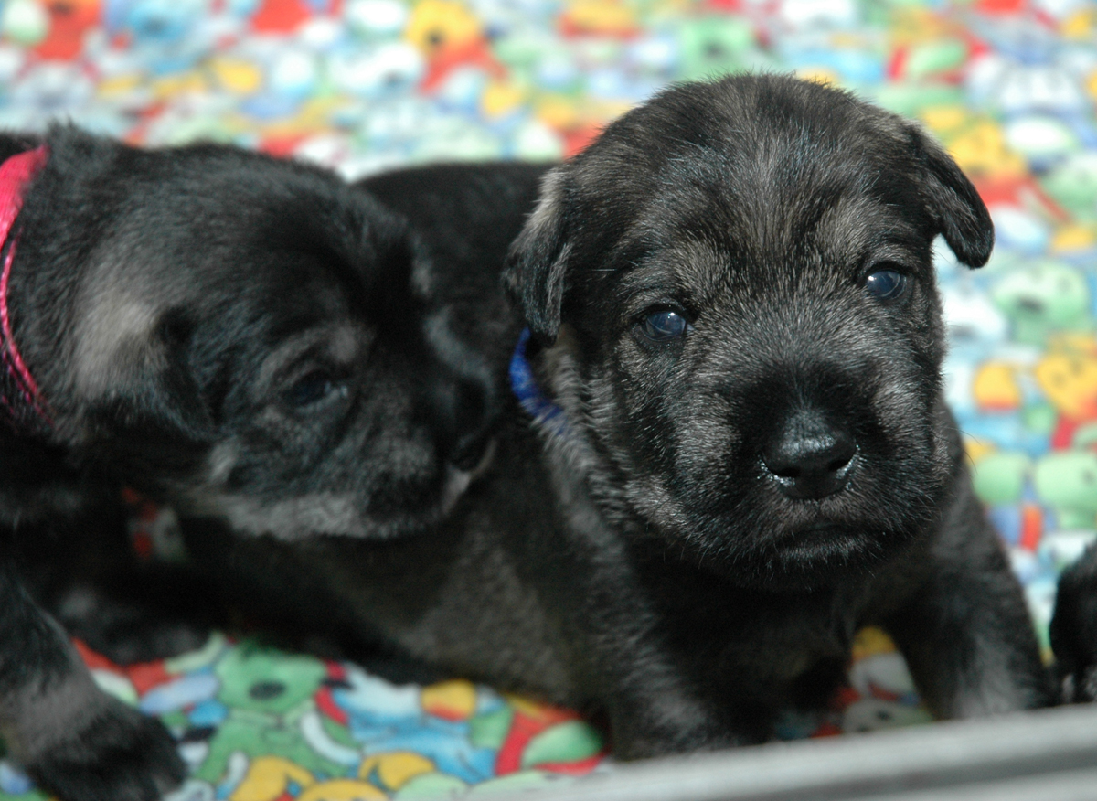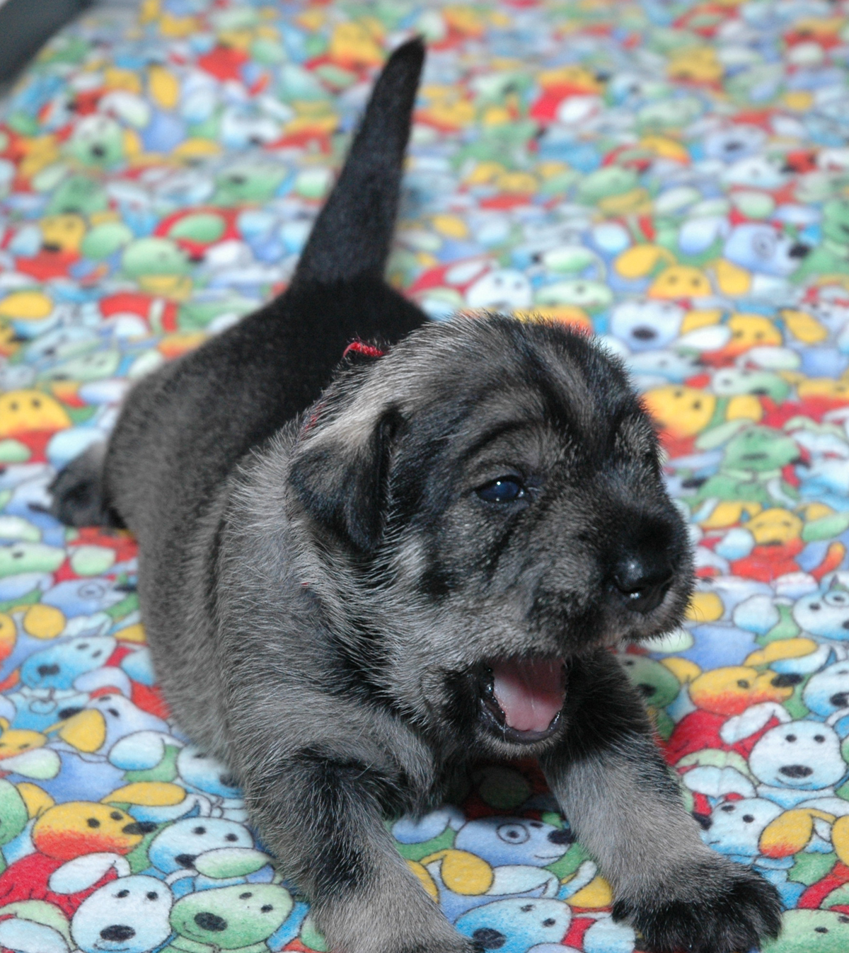 Here is Mr. Blue posing and showing us his little schnauzer face. In just a few days since their eyes started to open, their facial expressions have developed into real little schnauzers.