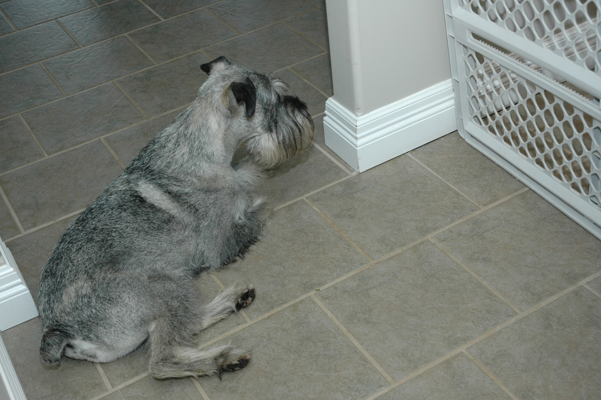 I could not finish tonight without posting a picture of Tempête waiting at the gate in case he could get a glimpse of those puppies. Tempête and Breeze have been on a vigil since the puppies arrived. Tempête lying down in front of the gate hoping for a glimpse and Breeze spinning and coming to get us to check on the puppies whenever they hear a sound from the nursery!