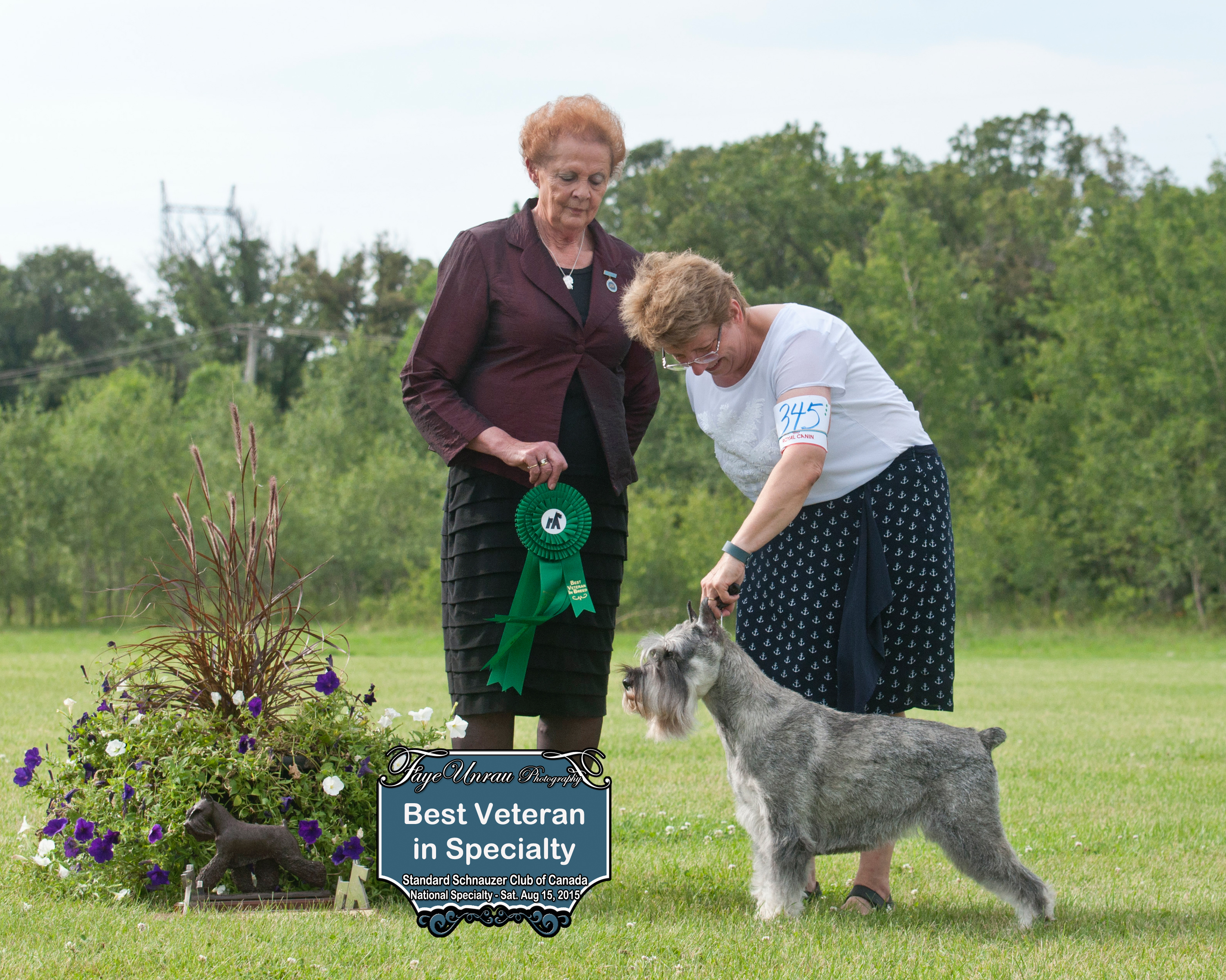 When we attended the Standard Schnauzer Club of Canada Specialty this summer in Winnipeg, Lia came out of retirement to show as a veteran at the specialty. In fact Lia was the oldest dog entered and she caught the eye of the Judge as she entered the ring ! Lia hardly needs me to go in the ring, she would likely get it all done without me 😉 coming back from the diagonal the judge asked me “She has done it all hasn’t she ?” with a big smile! As we took the picture later, I said BIS GChX Dinsdale Champagne Celebration RN, CGN ( and one leg short of her RA title) has had a full career with over 100 group placements, a Best all breed in Show , Rally title; but we might still go for that last leg for her Rally advance, who knows 🙂